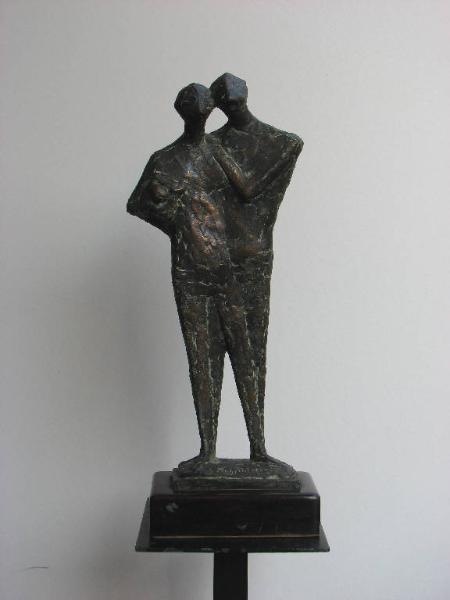 - NOTIZIE STORICO CRITICHE La scultura è pubblicata su un numero di "Giorni Vie Nuove" - settimanale diretto da Davide Lajolo (1969-1978) - a illustrazione di un articolo dedicato dallo stesso Lajolo all'amico Giuseppe Scalvini (Lajolo D. 1972).\nE' probabile che l'opera sia entrata a far parte della collezione dello scrittore a questa data e poi da lui sia stata donata alla compagna Angela Candiani, entrando così nella collezione di Milano.\nLa stessa scultura (corrispondono data e dimensioni), indicata come appartenente a "collezione privata", appare anche riprodotta nel catalogo della mostra di Scalvini tenutasi al Palazzo della Permanente di Milano nel 1996 (De Micheli M. 1996, pag. 51)\nIdentico, ma di diverse dimensioni, è invece il bronzo pubblicato sul catalogo di una mostra dello scultore tenutasi a Valenza nel 1990 (Scalvini 1990, pag. 7).\nIl soggetto rientra tra le tematiche care all'artista, che si impegna di frequente nella rappresentazione di sentimenti forti e basilari ("Maternità", "Coppie", "Figliol prodigo", "Grida") trasposti in gruppi scultorei in cui più figure fanno corpo unico dando origine a forme essenziali e geometricamente semplificate. \nCome fa notare Lajolo, tale scelta di linguaggio formale non svilisce però il valore umano e poetico di quanto raffigurato: "La figura si ritrova in geometrie e in sfuggenti presenze, in vuoti e in slanci di una spiritualità che non annulla la vita, anzi dà alla vita l'estro, l'ispirazione, l'idea. " (Lajolo D. 1972).