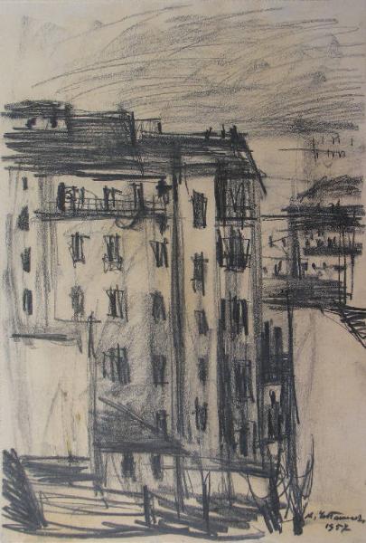 un caseggiato di sei piani occupa la parte sinistra e centrale del foglio; sulla destra, una strada e altri palazzi sullo sfondo