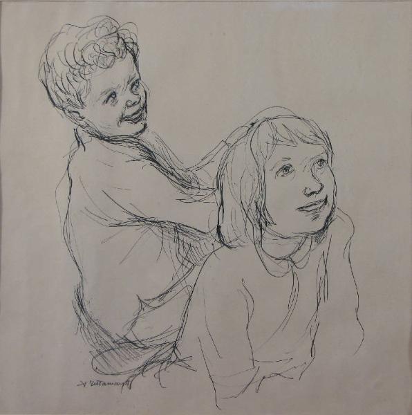 - NOTIZIE STORICO CRITICHE Come riferito da Angela Candiani, il disegno raffigura i figli dell'artista (2000, comunicazione orale). \nI ritratti, accanto ai nudi e alle nature morte, affiancano i soggetti più vincolati alle tematiche sociali normalmente scelti dal gruppo neorealista milanese di cui Tettamanti è tra i fondatori, insieme agli altri artisti raccoltisi nel secondo dopoguerra attorno alla Galleria 15 Borgonuovo (Brizzi, Fumagalli, Motti, Ramponi). \nAmpelio Tettamanti è uno dei primi nomi entrati a far parte della collezione Lajolo.\nCiò è testimoniato da una fotografia del 1964 che ritrae il salone dell'appartamento di via Bellezza con le pareti ancora vuote, se non appunto per la presenza di due disegni di Tettamanti: questo ritratto dei figli del pittore e la china con le mondine al lavoro (NSK 173).\nA quella data l'artista milanese era già prematuramente scomparso (1961), ma nell'immediato dopoguerra, quando Davide Lajolo era direttore dell' "Unità" e Angela Candiani vi lavorava come segretaria, Tettamanti - come racconta Lajolo stesso - prestava volontariamente la sua opera al giornale preparando, insieme ad altri artisti quali Giuseppe Motti ed Ernesto Treccani, i giornali murali che venivano affissi nei luoghi dove si tenevano i festival dell'Unità. \nLa prematura scomparsa del pittore è quasi certamente il motivo per cui non esistono articoli di Lajolo su Tettamanti, cominciando il giornalista a scrivere d'arte a a partire dalla fine degli anni '60 (Lajolo 1984).\nI disegni entrati a far parte della collezione potrebbero essere stati donati sia Lajolo che direttamente ad Angela.\nPotrebbero però essere anche doni fatti ad Angela dall'amica pittrice Antonia Ramponi, compagna di Tettamanti nel gruppo della Galleria 15 Borgonuovo.