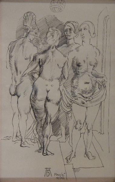 - NOTIZIE STORICO CRITICHE La china riprende un'incisione a bulino realizzata da Albrecht Durer nel 1497.\nL'opera dell'artista tedesco è nota sia con il titolo "Le quattro streghe" sia con quello de "Il Giudizio di Paride". \nIn questa versione di Mucchi, peraltro identica all'originale di Durer, mancano però quegli elementi (il teschio, la tibia, il mostro in fiamme) che orientano la critica a interpretare il soggetto raffigurato dal noto incisore come la rappresentazione di un gruppo di streghe. \nE' forse più probabile che Mucchi abbia inteso l'incisione del Durer come "Giudizio di Paride", soggetto già eseguito nel 1960 in tre litografie esplicitamente riprese da un quadro di Lucas Cranach (Ragghianti 1971, pag. 226).\nIl disegno della collezione Lajolo potrebbe essere lo studio preparatorio per un'altra stampa sullo stesso tema. \nLa ripresa da parte di Mucchi di opere di artisti tedeschi accanto alla sua produzione di tendenza realista si spiega con la sua vicinanza al mondo germanico, con cui entra in contatto una prima volta alla fine degli anni '20 e successivamente per un lungo periodo dal 1955 al 1961, quando insegna pittura all'Accademia di Berlino.