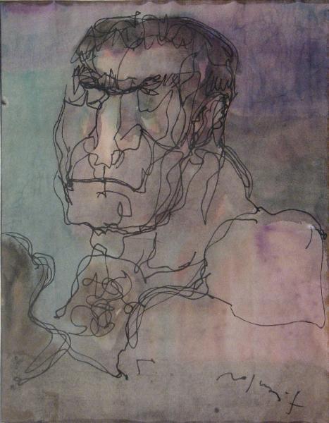 una linea mossa e continua disegna il volto e parte del busto di un uomo dai tratti somatici fortemente caratterizzati: mento squadrato, naso schacciato, occhipiccoli e sopracciglia folte; dove c'è la mano sembra di intravedere un guantone da pugile; sfondo viola-verde