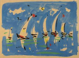 sette barche a vela sull'acqua; di ognuna appare il rispettivo riflesso; non c'è linea d'orizzonte che separa il cielo dal mare; lo sfondo è azzurro-blu con nuvole in alto e striature verdi nella zona in basso; il bianco-beige delle barche, dei riflessi sull'acqua e delle nuvole è quello della carta lasciata scoperta dal colore