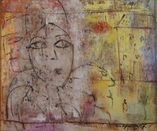 sfondo materico dalle diverse sfumature di colore (rosa, giallo, azzurro) su cui appaiono segnati come incisi sulla superficie i vari elementi figurativi: i volti di un gruppo di personaggi sulla sinistra (una donna al centro, in posizione frontale, e due uomini di profilo ai suoi lati) e un alto edificio sulla destra; in alto al centro, un piccolo sole rosso