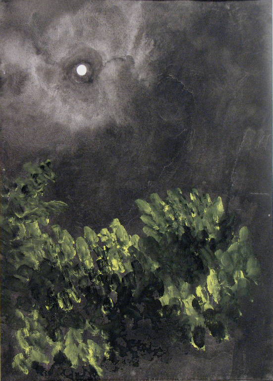 cielo notturno di colore nero-grigio con luna piena in alto a sinistra; la luna è circondata da nuvole che si rischiarano alla sua vicinanza; in basso, sopra la stesura nero-grigia del cielo è dipinto con un impasto più denso di colore il fogliame di alcuni alberi, il cui verde diventa giallo là dove è rischiarato dalla luce della luna