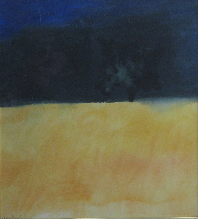 - NOTIZIE STORICO CRITICHE Nella produzione pittorica di Mattioli l'attenzione al paesaggio si concretizza tra la fine degli anni '60 e il decennio successivo.\nTra i soggetti privilegiati nell'ambito del paesaggio vi è questo dell'albero isolato su distese di prati o campi, reso con un utilizzo minimo dei colori della tavolozza, generalmente ridotti a due o a tre. \nIl soggetto viene affrontato dall'artista in plurime versioni apparentemente identiche ma in realtà differenti una dall'altra per particolari, tanto che il nome di Mattioli viene spesso affiancato a quello di Giorgio Morandi a motivo di una ricerca comune che si sofferma su pochi elementi di spunto esterni per indagare in profondità il linguaggio e gli strumenti della pittura.\nScrive Roberto Tassi a proposito di questi paesaggi di Mattioli: "l'immagine non ha più logicamente il senso della veduta, del rapporto naturalistico con la realtà; proprio in quanto è presa come frammento, e come tale soltanto si dà, ha perso ogni connotazione di spazio e di tempo che possa ricondurla ad una vita della natura, è ridotta a pochissimi elementi che subiscono da un'opera all'altra minime variazioni, e che stanno insieme a formare l'emblema di un corpo privo già di ogni sangue. Quando poi dietro questa collina, su cui è rimasto un solo "modello" di albero, scende una parete di nero così fitto, così profondo da non poter corrispondere a una notte ma ormai solo a una tragica oscurità lunare, allora l'opera diventa una paurosa profezia del nostro avvenire." (Mostra antologica 1971).\nIl dipinto della collezione Lajolo potrebbe essere quello di cui Lajolo stesso parla in un articolo pubblicato su "Il Mondo", interamente dedicato all'artista: "Io posseggo un acquerello di Mattioli, uno dei suoi alberi solitari." (Lajolo 1975).