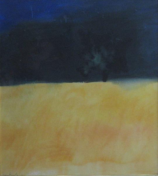 albero posto sulla linea d'orizzonte che separa un campo di colore giallo intenso dal cielo blu scuro; la chioma dell'albero è resa macchiando con l'acqua la stesura d'acquerello blu del cielo