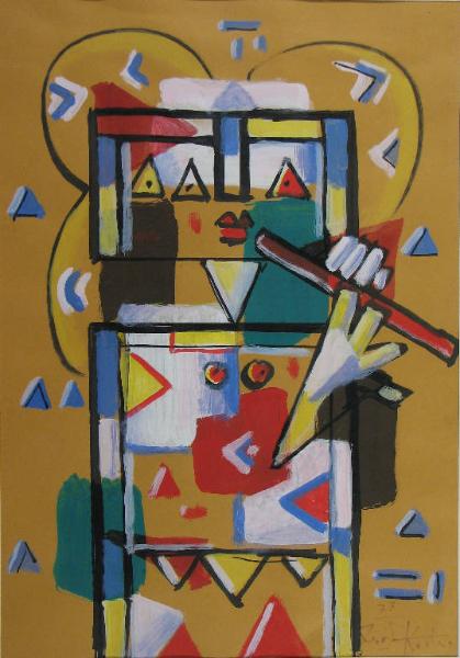 figura femminile vista in posizione frontale mentre suona il flauto; ogni cosa è rappresentata mediante l'assemblamento di forme geometriche: rettangoli costituiscono la testa e il corpo; triangoli gli occhi; piccoli cerchi i seni; lo sfondo è lo stesso colore giallo della carta, lasciata scoperta; l'elementarietà della composizione è spezzata dall'inserimento di frammenti variamente colorati all'interno del corpo della figura