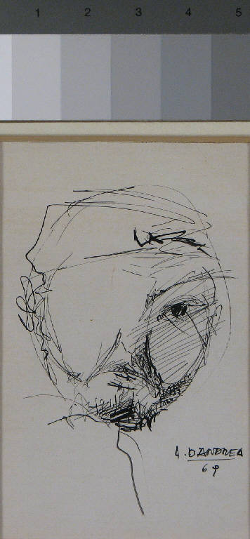 - NOTIZIE STORICO CRITICHE Il disegno è tracciato su un biglietto di corrispondenza che reca, sull'altro lato, un saluto rivolto o a Davide Lajolo o alla compagna, Angela Candiani (il destinatario non è indicato), firmato da Vittorio Grotti.\nMesso a confronto con altri ritratti di Grotti, il volto qui raffigurato da Lorenzo D'Andrea risulta essere proprio quello del firmatario del biglietto (v. ritratto su http://www.consiglio.regione.toscana.it/presidente/pinacoteca/opera.asp?codice=53&autore=46).\nGrotti, nato a Camaiore (Lucca), dove D'Andrea vive e lavora, è noto come poeta e animatore di eventi culturali ed artistici, nonchè come promotore del lavoro di alcuni pittori, tra cui Fausto Liberatore e lo stesso D¿Andrea.\nE' proprio attraverso Liberatore, deputato in Parlamento insieme a Davide Lajolo, che D'Andrea conosce lo scrittore (Lajolo 1984). \nDa allora entra in rapporti amichevoli sia con lui che con la Candiani, alla quale sono dedicati molti dei suoi disegni conservati in collezione.