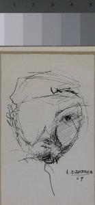 volto di uomo con la barba; la parte destra del viso è ombreggiata con un tratteggio, mentre a sinistra la zona dell'orbita è lasciata bianca; l'uomo indossa un berretto al cui centro sembra esserci una spilla (falce e martello?)