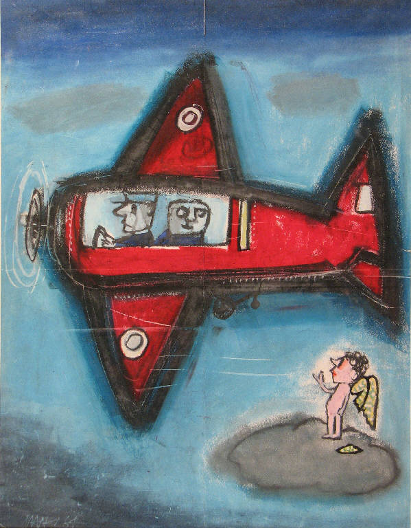 un angioletto con un'ala spezzata, in piedi su una piccola nube, fa cenni al pilota e al passeggero di un aereo rosso che percorre il cielo; sfondo azzurro-blu