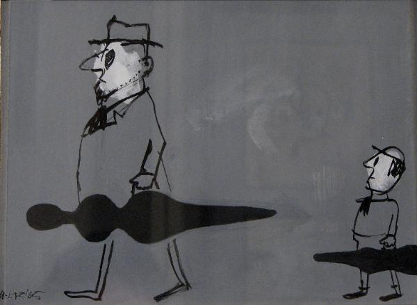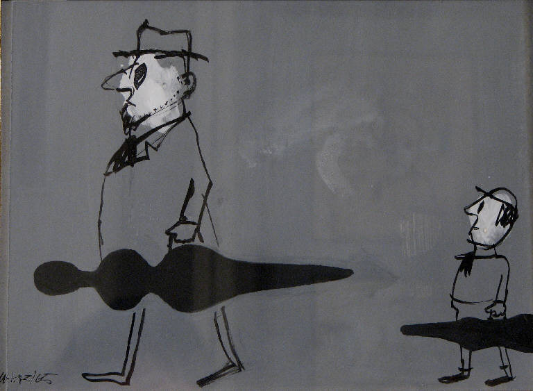 - NOTIZIE STORICO CRITICHE Il disegno è una delle vignette realizzate da Manzi per il mensile "Successo".\nSul retro del foglio, scritta a mano dal disegnatore, vi è anche la didascalia con la battuta umoristica che accompagna l'immagine. \nSempre sul retro sono registrati inoltre, con appositi timbri, tutti i dati relativi all'ingresso del disegno in redazione prima della stampa ("4 Mag. 1965") e al numero della rivista su cui esso è stato poi pubblicato, ad apertura della pagina intitolata "Le nostre vignette" (Successo 1965).\nIl mensile "Successo" era edito dalla Aldo Palazzi, la stessa casa editrice del settimanale "Tempo illustrato" per cui Angela Candiani lavora tra il 1960 e il 1974: è a motivo di ciò, infatti, che la Candiani ricorda di avere conosciuto Riccardo Manzi (2000, comunicazione orale). \nL'opera dunque entra a far parte della collezione Lajolo attraverso Angela Candiani, anche se, piuttosto che tramite Manzi stesso, è probabilmente tramite la redazione che in questo caso lei riesce ad avere il disegno dopo la sua pubblicazione.\nRiccardo Manzi fa parte di quella minoranza di artisti presenti all'interno della collezione Lajolo che, legati alla Candiani e non a Davide Lajolo, non figurano tra i nomi di coloro dei quali lo scrittore si è interessato dedicando loro articoli e presentazioni di mostre.\nPiù legato al mondo dell'illustrazione che a quello della pittura, Manzi si dedica però anche a quest'ultima e ha modo di esporre il suo lavoro in diverse occasioni: tra esse, una mostra alla Saletta di Modena in cui è presentato da Alfonso Gatto (Gatto 1955).\nAnche per quanto concerne strettamente la sua produzione di illustrazioni e vignette si è comunque discusso del valore pittorico in esse presente. \n"Il problema resta se il segno grafico, rivestito di colore, sia pittura, se cioè la visione di Manzi sia anche pittorica oltre che letteraria": così commenta Giuseppe Longo nell'introduzione ad un libro del 1961 che raccoglie vignette umoristiche di Manzi sulla vita di coppia, concludendo infine che, coesistendo in lui gli echi di tutte le pittoriche e di tutte le più rinomate espressioni grafiche degli ultimi cinquant'anni come si riscontra nel lavoro di tutti gli artisti, egli può essere considerato pittore a pieno titolo (Vivere due, 1961).