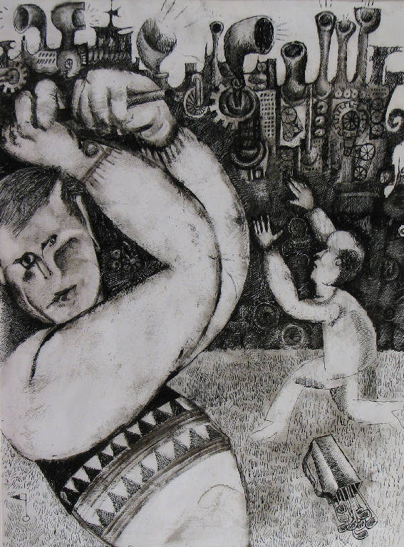 - NOTIZIE STORICO CRITICHE Il dipinto fa parte della produzione di illustrazioni realizzate da Pericoli per giornali e riviste a partire dal momento in cui egli giunge a Milano, nel 1961.\nSul retro del foglio compare infatti, segnata a matita, la scritta "Succ": la stessa scritta compare sul retro di altre opere della collezione Lajolo, provenienti dalla redazione del mensile "Successo" (NSK 215-216); in quei casi, accanto ad essa appare però anche il timbro dell'Archivio fotografico della Aldo Palazzi Editore, qui invece assente.\nL'opera di Pericoli è effettivamente una delle tre illustrazioni, da lui eseguite, pubblicate su quella rivista a corredo di un articolo di Pietro Di Gennaro. Nell'articolo, dal titolo "Uomo x uomo y. Quando il management diventa scienza", l'autore, immaginando le conseguenze dell'introduzione degli elaboratori elettronici nel settore lavorativo, tra le altre cose scrive: "Si profila la fabbrica del futuro costituita come qualcuno ha detto scherzosamente da "impianti automatici circondati da campi da golf dai quali i lavoratori sono chiamati ad intervenire da sirene di emergenza" (Successo 1967).\nE' esattamente questa parte del lungo articolo che Pericoli traduce in immagine nel dipinto conservato all'interno della collezione Lajolo.\nLa casa editrice del mensile "Successo", la Aldo Palazzi, è la stessa per la quale, tra il 1960 e il 1974, lavora anche Angela Candiani (per il settimanale "Tempo illustrato"), ed è proprio a motivo di ciò che lei ricorda di avere conosciuto Tullio Pericoli (2000, comunicazione orale). \nSicuramente dunque è tramite lei che l'opera entra a far parte della collezione Lajolo. \nPericoli infatti fa parte di quella minoranza di artisti presenti all'interno della collezione che, legati alla Candiani e non a Davide Lajolo, non figurano tra i nomi di coloro dei quali lo scrittore si è interessato dedicando loro articoli e presentazioni di mostre.\nAll'epoca della realizzazione di quest'opera, Pericoli ha già esordito come pittore (1963) e ha lavorato frequentemente sul soggetto della città contrapposta al singolo, che sembra essere presente anche in questo dipinto (Tullio Pericoli 1972). \nIn esso inoltre si può notare l'utilizzo di una tecnica particolare in cui il disegno a china non è eseguito direttamente sulla carta ma su una stesura di colore acrilico bianco sulla quale l'artista lavora imprimendovi diverse "textures".\nLa tecnica corrisponde a quella descritta tra i primi passaggi del procedimento pittorico illustrato da Arturo Carlo Quintavalle nel catalogo in cui il critico introduce una serie di dipinti di Pericoli, raffiguranti paesaggi, presentati nel 1972 in una mostra a Milano, alla Galleria Angolare Arte Contemporanea (Quintavalle 1972). \nQuesto lavoro potrebbe dunque rappresentare uno dei momenti iniziali dell'elaborazione di quel complesso procedimento, che giungerà ad esiti definitivi qualche anno dopo.