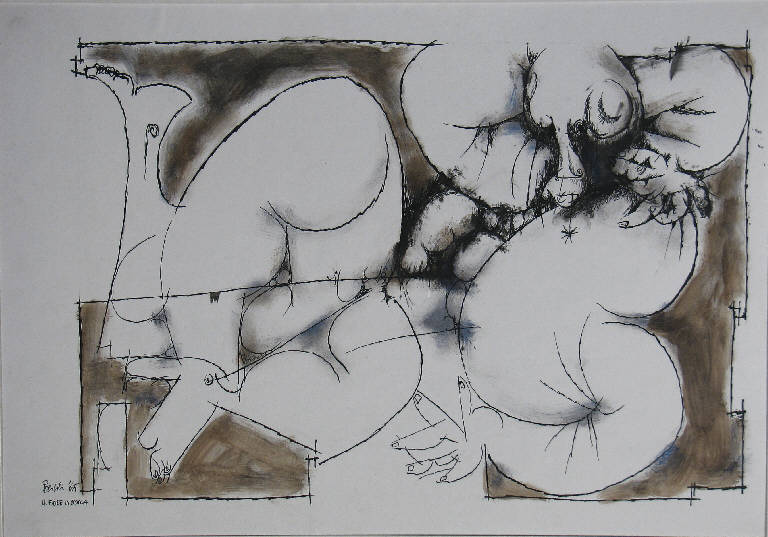 nudo di personaggio maschile sdraiato; corpo quasi deforme, con testa animalesca; dalle labbra sporge in fiore; il personaggio è inscritto in una riquadratura a china dallo sfondo marrone