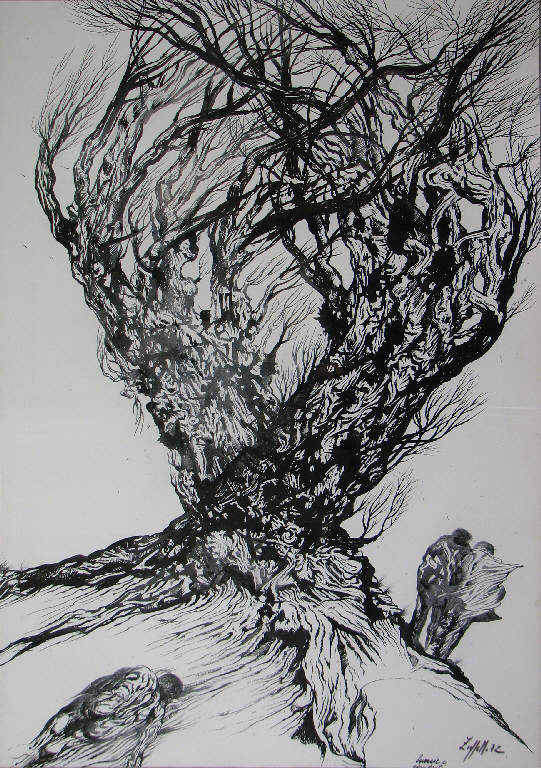 - NOTIZIE STORICO CRITICHE La tecnica del disegno eseguito a china su fogli di grandi dimensioni è quella su cui si concentra la ricerca di Zuppelli a partire almeno dal 1969, anno in cui l'artista vince con un simile lavoro un premio acquisto alla XXII edizione del Premio Suzzara.\nSecondo il parere di Davide Lajolo, quello di Zuppelli è un disegno che diventa pittura (Lajolo 1975).\nNei lavori dell'artista, l'immagine sembra prendere forma da macchie di inchiostro attraverso l'abile utilizzo di una tecnica vicina al linguaggio surrealista e informale.\n"In quei segni che a prima vista paiono usciti di getto, rabbiosi, fatti di istinto, scopri invece una meditazione. Zuppelli li ha voluti così con la ragione" scrive Lajolo (Lajolo 1972).\nIl commento appare su "Giorni Vie Nuove", nella recensione ad una mostra che Zuppelli tiene nel 1972 alla Galleria milanese La Nuova Sfera, mostra cui questo disegno, datato quello stesso anno, potrebbe aver partecipato, per essere donato poi al giornalista proprio in ringraziamento dell'articolo pubblicato.\nNella recensione, Lajolo sottolinea il movimento che nei lavori dell'artista anima personaggi e cose, come appare evidente anche in questo disegno.\n"(...) aria per Zuppelli è vento, è bufera che rapisce, che trascina, che imprime agli uomini, alle piante, alle case il movimento come fossero in corsa perenne". Lo scrittore attribuisce questa caratteristica ad uno spirito romantico che anima Zuppelli e il suo mondo.\nNel catalogo della mostra Raffaele De Grada parla invece di "nuovo realismo", sottolineando l'attenzione dell'artista nei confronti dei contenuti, sempre più esplicitamente espressi una volta superato il passaggio attraverso una fase "simbolista", componente ritenuta comunque presente all'interno della sua opera (De Grada 1972).\nAnche il disegno della collezione Lajolo è da leggere come una rappresentazione simbolica della caducità della vita umana, dove le querce hanno il ruolo di raffigurare l'eterno di contro al passaggio dei "viandanti" che trovano la morte ai loro piedi.