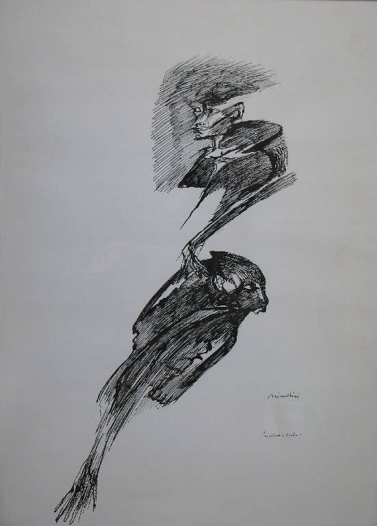 • NOTIZIE STORICO CRITICHE Il disegno raffigura un soggetto più volte affrontato dall'artista in pittura.\nDopo avere realizzato il ciclo sulla "Storia del fascismo" - in due serie, nel 1958 e nel 1965 - Brindisi comincia infatti a lavorare, nel corso degli anni '60, sul tema di una violenza non più legata a individuate situazioni storiche bensì comunemente insita nell'uomo come una sorta di "patologia universale" come la definisce il critico Riccardo Barletta (Barletta R. 1995).\nEssa viene rappresentata dal pittore attraverso tipologie di figure che ne impersonificano vari aspetti: "Vincitore e vinto", insieme a "Oppositore", "Uomo muro", "Fratello contro fratello" e altri soggetti da questo momento protagonisti dei dipinti dell'artista. \nI personaggi raffigurati, sia quelli colpevoli di nuocere ai propri simili sia le loro vittime, rispondono all'intento di Brindisi di rendere la violenza odiosa: per questo appaiono espressionisticamente deformati e resi mostruosi in un'immagine che vuole urtare di proposito lo spettatore.\nSe in pittura tale deformazione viene ottenuta attraverso l'azione manuale del pennello, in un "raptus" per certi aspetti vicino a quello informale benchè utilizzato per aggredire la raffigurazione del corporeo; nella grafica, come si può riscontrare in questo lavoro della collezione Lajolo, resta ancora in evidenza l'azione del segno, per quanto essa appaia più controllata: un segno che comunque graffia e dissocia la figura umana in tantissime fibre, all'interno di una composizione sintetica in cui l'intera immagine si presenta come lacerata e ridotta in brandelli.\nEvidente qui è inoltre l'assimilazione dell'uomo alla bestia: un rapace con artiglio il "vincitore", un uccello dalle ali tarpate il "vinto" a lui sottomesso.\nIl tema del "Vincitore e vinto", intrapreso dall'artista a partire dagli anni '60, viene portato avanti almeno fino al penultimo decennio del secolo. \nNelle composizioni più recenti però le figure appaiono generalmente frontali, una dietro le spalle dell'altra (Remo Brindisi 1995, pag. 204). \nIl disegno della collezione Lajolo, non datato, risulta invece molto vicino a un dipinto con lo stesso soggetto realizzato nel 1966 in cui i busti dei due personaggi sono raffigurati di profilo, con l'identico atteggiamento del vincitore di tenere afferrato con la mano il vinto, quest'ultimo reclinato su sè stesso (Remo Brindisi 1995, pag. 124).\nLa figura del "vincitore" appare inoltre assai simile a quella dell' "Oppositore in agguato", dipinto anch'esso realizzato negli anni '60 (Remo Brindisi 1995, pag. 99).