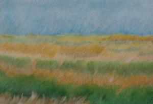 campo verde con striature gialle; al di sopra di una piatta linea d'orizzonte, cielo azzurro; la superficie del foglio è interamente utilizzata e coperta di colore