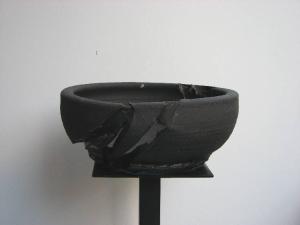 vaso basso dall'ampia bocca circolare; la superficie esterna appare squarciata da tre lunghi tagli; un altro segno percorre meno in profondità l'interno del vaso; colore nero opaco, lucido negli squarci