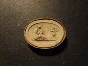 Calco circondato da una fascetta in carta bordata d'oro; le misure del calco e della fascetta insieme sono cm 2.5x3.2.