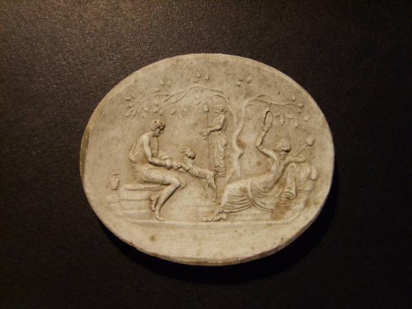 Scena mitologica con pastore e filatrice