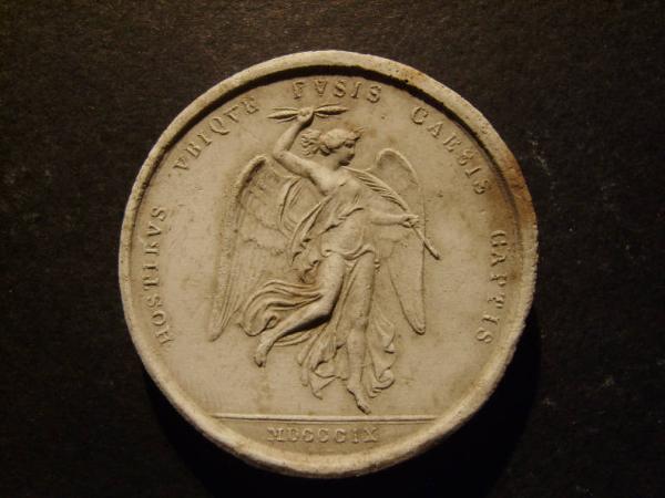 - NOTIZIE STORICO CRITICHE Medaglia commemorativa di una battaglia napoleonica combattuta il 5 ed il 6 luglio 1809 contro l'Austria e nella quale entrambi gli schieramenti ebbero ingenti perdite; questa di Wagram fu l'ultima battaglia della campagna per cui venne realizzata una medaglia commemorativa. La figura della vittoria alata si ispira ad una figura dei dipinti murali di Pompei.