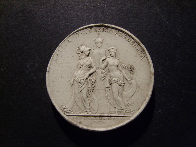 Medaglia commemorativa della federazione franco-americana. Francia ed America appoggiate ad un'erma