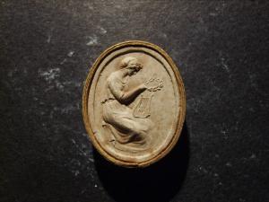 Calco circondato da una fascetta in carta bordata d'oro; le misure del calco e della fascetta insieme sono cm 3.1x2.6.