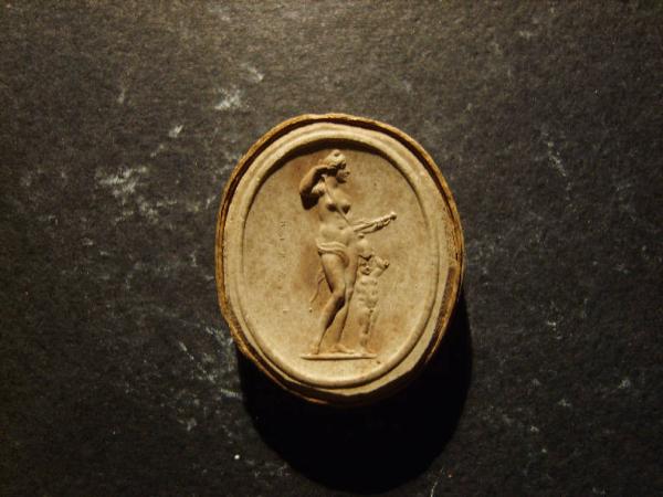 Calco circondato da una fascetta in carta bordata d'oro; le misure del calco e della fascetta insieme sono cm 2.8x2.5.
