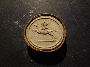 Calco circondato da una fascetta in carta bordata d'oro; le misure del calco e della fascetta insieme sono cm 2.8x3.1.