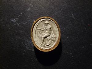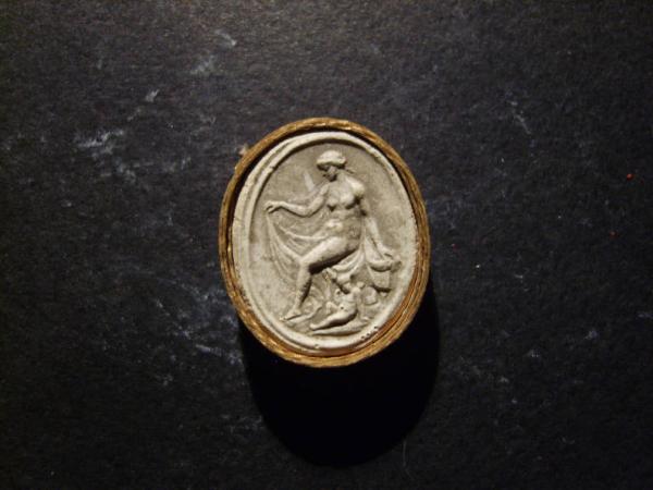 Calco circondato da una fascetta in carta bordata d'oro; le misure del calco e della fascetta insieme sono cm 2.6x2.1.