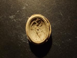 Calco circondato da una fascetta in carta bordata d'oro; le misure del calco e della fascetta insieme sono cm 2.5x2.1.
