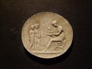 Scena mitologica di figura femminile che tiene in braccio un bambino neonato alla presenza di due fanciulli