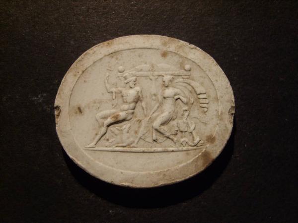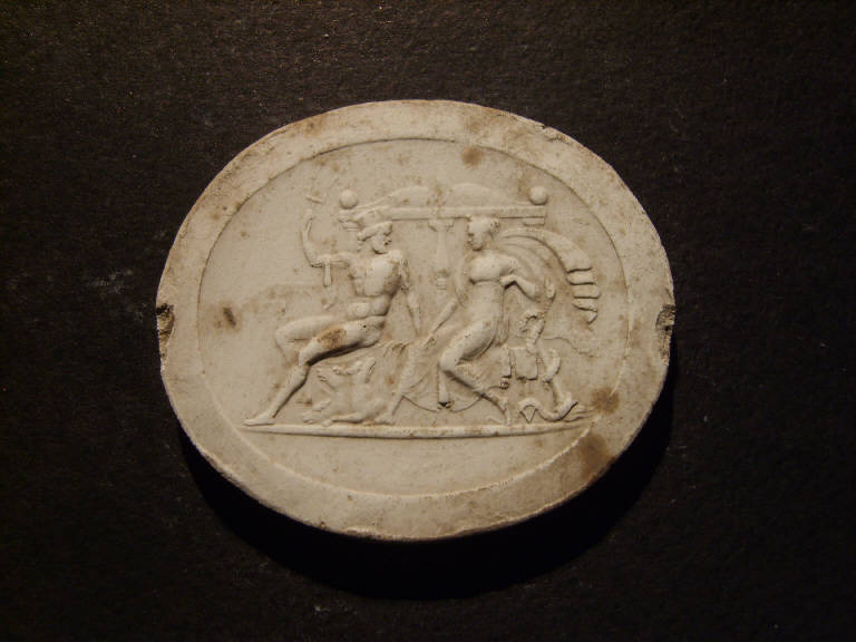 Achille (?) seduto su un letto con Cerbero e figura femminile vicino