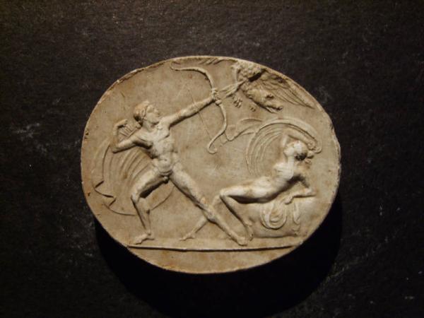 Scena mitologica con eroe che uccide un'aquila con testa di cane per proteggere una fanciulla