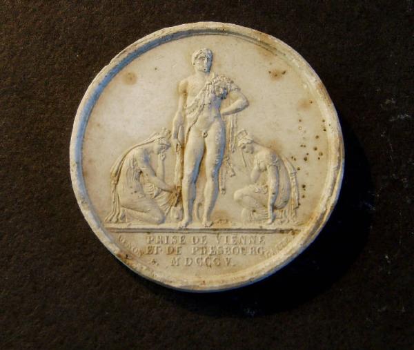 Medaglia commemorativa della presa di Vienna e di Presburgo. Allegoria di Vienna e allegoria di Presburgo si inginocchiano ad Ercole