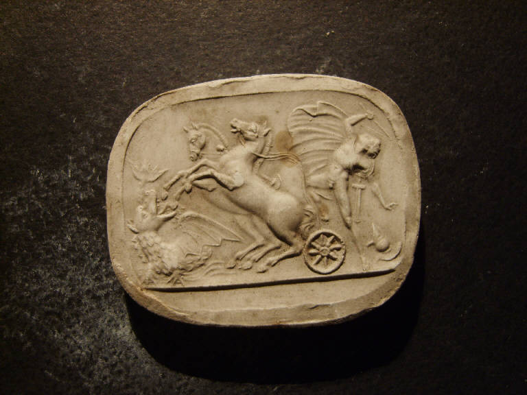 Scena mitologica con cavalli di una biga guidata da un guerriero che impennano davanti ad un drago