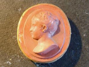 Calco circondato da una fascetta in carta bordata d'oro; le misure del calco e della fascetta insieme sono cm 3.7x3.2.