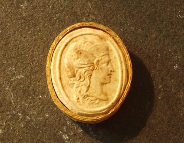 Calco circondato da una fascetta in carta bordata d'oro; le misure del calco e della fascetta insieme sono cm 2.7x2.2.