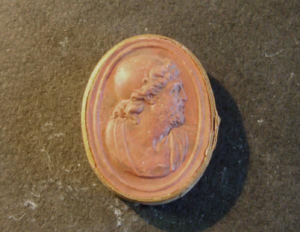 Calco circondato da una fascetta in carta bordata d'oro; le misure del calco e della fascetta insieme sono cm 3.4x2.6