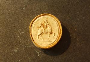 Calco circondato da una fascetta in carta bordata d'oro; le misure del calco e della fascetta insieme sono cm 2.5x2.7.