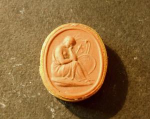 Calco circondato da una fascetta in carta bordata d'oro; le misure del calco e della fascetta insieme sono cm 2.7x2.2.