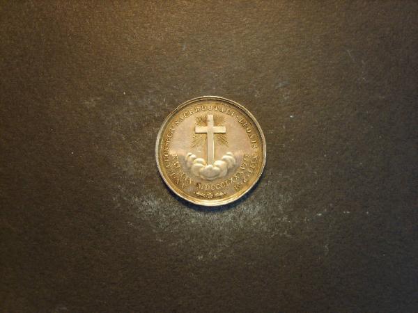 Medaglia commemorativa del cinquantesimo di sacerdozio di papa Leone XIII. Ritratto di Leone XIII/ Croce