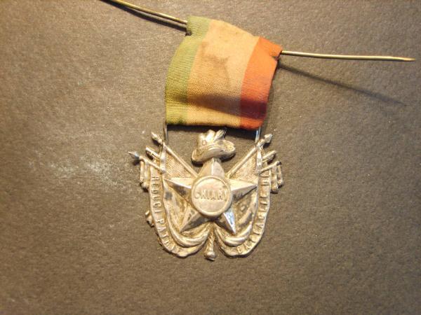 Medaglia appesa ad un nastro di seta a fasce verdi, bianche e rosse.