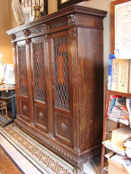 Libreria in stile neobarocco con piedi in foggia di zampa leonina, e base baccellata rigonfia. Il mobile è spartito in tre campi da quattro paraste scanalate in stile vagamente corinzio reggenti un fregio a motivi vegetali intervallata da mascheroni e terminante con cornice a ovuli stilizzati. Le tre ante sono decorate in basso con altrettanti campi quadrati centrati da rosette e nella porzione superiore da specchiature in vetro protette da grate in ferro battuto. I fianchi non presentano decorazioni.