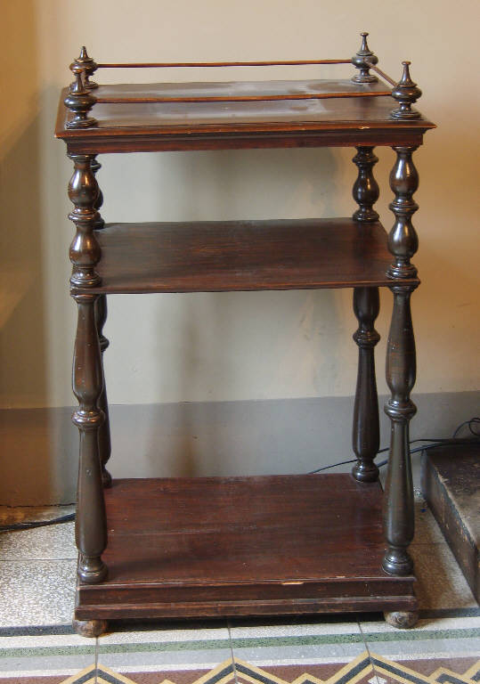 Scaffale a tre ripiani con colonnette bombate e terminanti al culmine con motivo a cipolla.