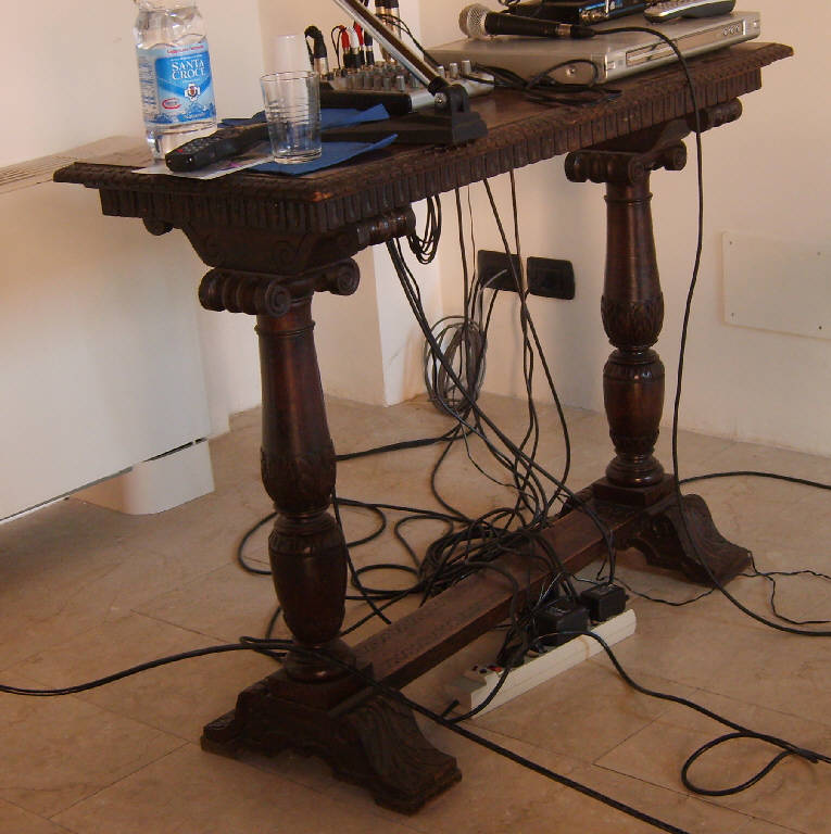 In stile neobarocco, presenta moduli decorativi con colonne a candelabra con capitello ionico; il ripiano, liscio, termina con cornice a pelte.