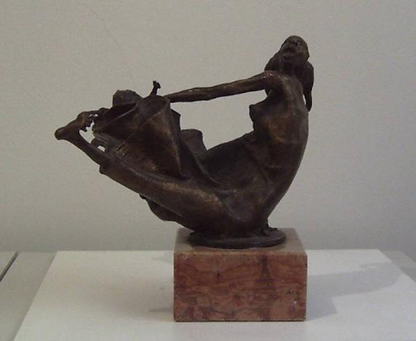 Figura femminile seduta con il busto alzato e le gambe divaricate e anch'esse alzate verso l'alto; dalla lunga gonna esce un bambino che la donna strappa a forza emettendo un grido di dolore.