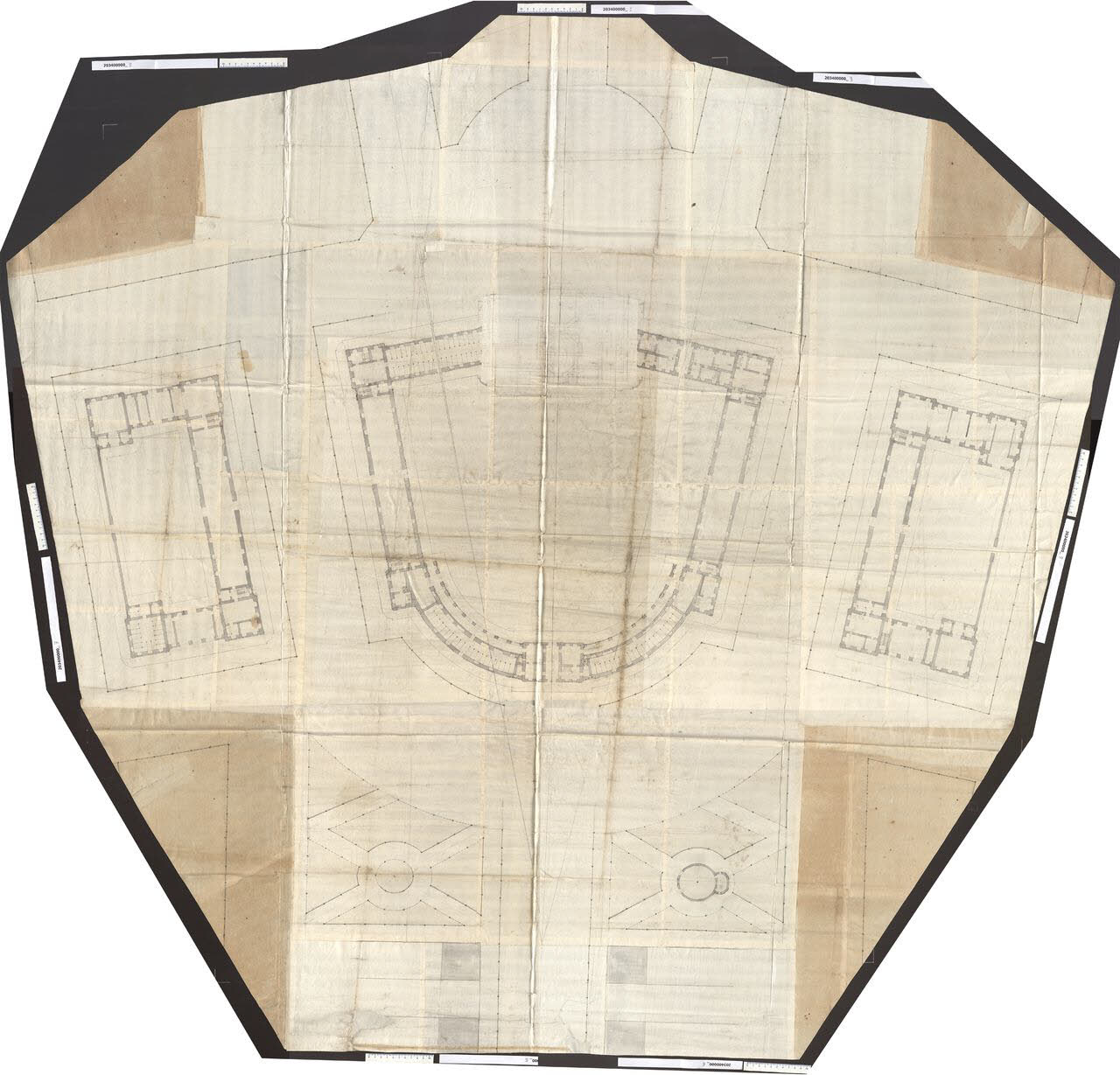 disegno sagomato, conserva tracce della preliminare costruzione a grafite; è eseguito a inchiostro bruno utilizzando tiralinee e compasso; campiture di acquerello grigio nello spessore delle murature. Il disegno è tracciato su supporto composto da 32 fogli di carta di diversa consistenza incollati; sul foglio era applicato un pentimento su carta mm. 142 x 259, ora distaccato. Il corretto orientamento del disegno prevede che il corpo di fabbrica con la sala ottagonale sia verso il basso