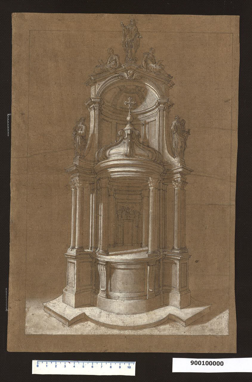 - NOTIZIE STORICO CRITICHE L'altare qui rappresentato non è identificabile e non è stato possibile stabilire se il disegno sia un progetto o, più probabilmente, una copia di studio forse risalente al primo periodo romano di Domenico Martinelli, come ipotizza Hellmut Lorenz (Lorenz 1991, M KAT 87, pagg. 267-268).\nL'attribuzione a Martinelli deriva dalla particolare tecnica di rappresentazione da lui usata proprio in quel periodo, come riferisce anche il biografo Giovanni Battista Franceschini nelle sue "Memorie della vita di Domenico Martinelli" del 1772 (Lorenz 1991, p. 130), che ritroviamo anche in altri disegni da lui realizzati (Milano, Collezione Sardini Martinelli inv. 9,34 e 4,6): il disegno è tracciato su carta marrone scuro e le zone in luce sono evidenziate con sfumature bianco-argentate. L'altare racchiude nella sua notevole plasticità tutti gli elementi architettonici espressione del gusto barocco romano, dalla giustapposizione di elementi concavi e convessi, all'inserimento nella composizione di gruppi scultorei.\nIl disegno può essere associato a un altro studio di altare di proporzioni maggiori presente nella collezione milanese, come già evidenziato da Lorenz (Lorenz 1991, cit.), che presenta lo stesso motivo di calotta emisferica (Milano, Collezione Sardini Martinelli inv. 4,6) e che lo studioso ipotizza essere un altare per la chiesa del re polacco Jan III Sobieski.