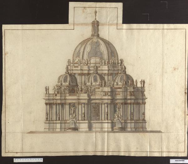 - NOTIZIE STORICO CRITICHE Sono sconosciute le circostanze che portano Domenico Martinelli a progettare alcuni edifici (mai realizzati) per il re Polacco Jan III Sobiesky (1679-1696), sono invece noti gli indirizzi della politica culturale e artistica del re, orientata principalmente verso Roma e all'ambiente dell'Accademia di S. Luca. Oltre a ciò, possono aver svolto un ruolo importante per i contatti con il Martinelli i rapporti personali del Sobiesky, che aveva come segretario personale Tommaso Talenti, proveniente da Lucca e, il fatto che il cardinale Francesco Bonvisi, lucchese, era l'inviato papale a Varsavia. Una data possibile per i progetti del Martinelli è quella del 1684, quando il re manda a Roma il suo confessore quale inviato artistico. Il disegno rientra in questo gruppo di progetti e si riferisce alla struttura monumentale di una fontana consistente in uno spazio esagonale coperto da una cupola, collegato ad una struttura esterna di 12 lati, sulla quale sei piccoli vani cupolati, aperti in corrispondenza delle colonne architravate, si alternano a nicchie sotto le quali stanno delle vasche che raccolgono l'acqua che sgorga alla base dei gruppi scultorei (cfr. la pianta in Milano, Collezione Sardini Martinelli inv. 9,141). Per il prospetto, Martinelli, prevede due soluzioni: a sinistra i lati sono unificati da una balaustra decorata con statue, che lascia intravedere il tamburo delle piccole cupole retrostanti; a destra, sopra la trabeazione, viene inserita un'alta fascia decorata da bassorilievi, con sovrapposta balaustra ornata di statue, in tal modo resta visibile solo la calotta delle cupole posteriori. Non è chiaro in che modo si potesse accedere allo spazio interno.