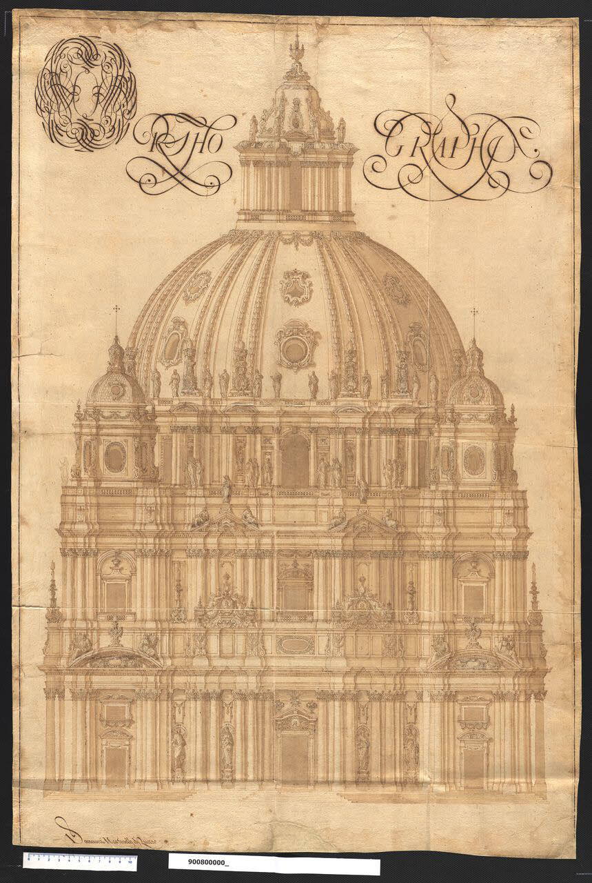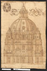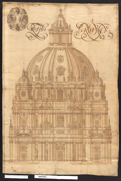 - NOTIZIE STORICO CRITICHE ll disegno rientra nel gruppo dei progetti, mai realizzati, che Martinelli elabora per il re di Polonia Jan III Sobiesky (1679-1696). Sono sconosciute le circostanze che portano Domenico Martinelli a progettare alcuni edifici per il re polacco, sono invece noti gli indirizzi della sua politica culturale e artistica, orientata principalmente verso Roma e all'ambiente dell'Accademia di S. Luca. Oltre a ciò, possono aver svolto un ruolo importante per i contatti con il Martinelli i rapporti personali del Sobiesky, che aveva come segretario personale Tommaso Talenti, proveniente da Lucca e, il fatto che il cardinale Francesco Bonvisi, lucchese, era l'inviato papale a Varsavia. Una data possibile per i progetti del Martinelli è quella del 1684, quando il re manda a Roma il suo confessore quale inviato artistico. Il presente disegno è tra quelli predisposti dal Martinelli per la chiesa monumentale, un progetto che prevede due fasi: la prima di studio della pianta e della facciata; la seconda alla soluzione definitiva della facciata, della cripta, della sezione longitudinale e della pianta del tamburo. Sul foglio in esame Martinelli traccia la soluzione definitiva per la facciata della chiesa. Già le enormi dimensioni dell’edificio, circa 100 metri di lunghezza, 61 di larghezza, alta fino alla lanterna 100 metri, nonché il largo impiego di colonne libere, candelabre, statue, rilievi, indicano il carattere “ideale” di questo progetto, che Martinelli deve aver concepito anche esempio delle proprie capacità, da presentare al re polacco. Tutti gli elementi hanno dimensioni notevoli: le colonne (12 metri) sono alte come quelle del portico del Pantheon, mentre le statue della zona inferiore sono alte 6 metri. Gli enormi candelabri e fiaccole sono forse l'indizio che questo edificio, doveva essere stato concepito come pantheon o monumento funerario. In questo senso va interpretata anche la presenza di una cripta. Nonostante si tratti di un progetto molto ambizioso, l'impianto proposto dal Martinelli avrà un seguito e, nel concorso dell'Accademia di S. Luca del 1713, per un tempio rotondo con portico, sarà oggetto di imitazione da parte dei vari concorrenti.